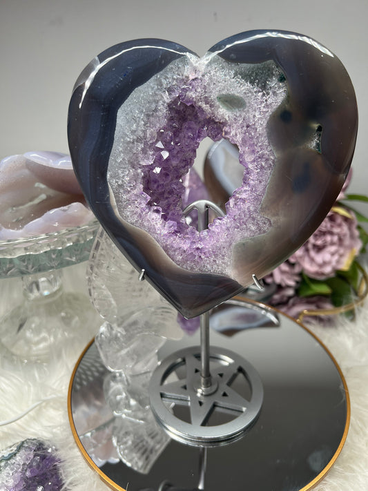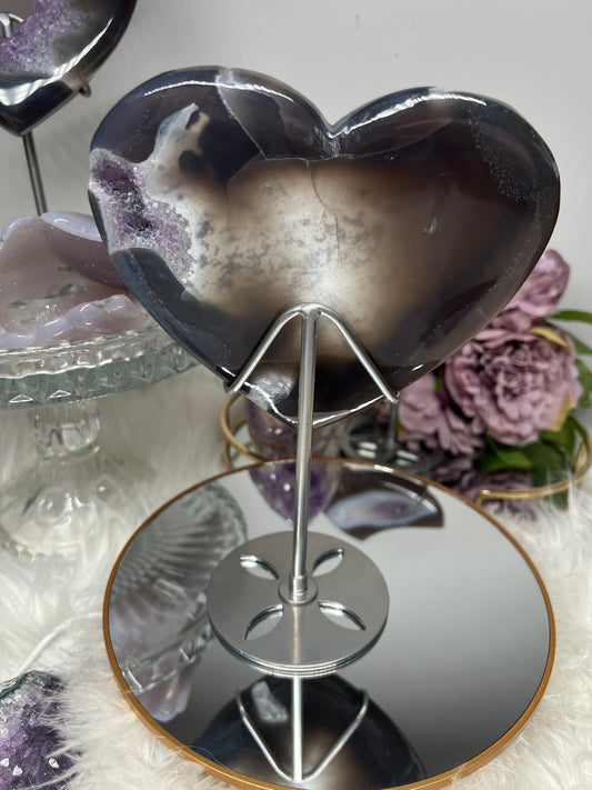 Amethyst & agate with moss agate inclusions sparkly heart with metal stand