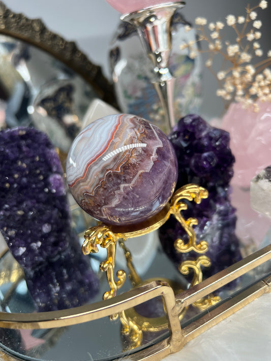 Mexican crazy lace agate with amethyst sphere