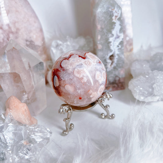 Pyrite, flower agate, carnelian, blue chalcedony & quartz sphere