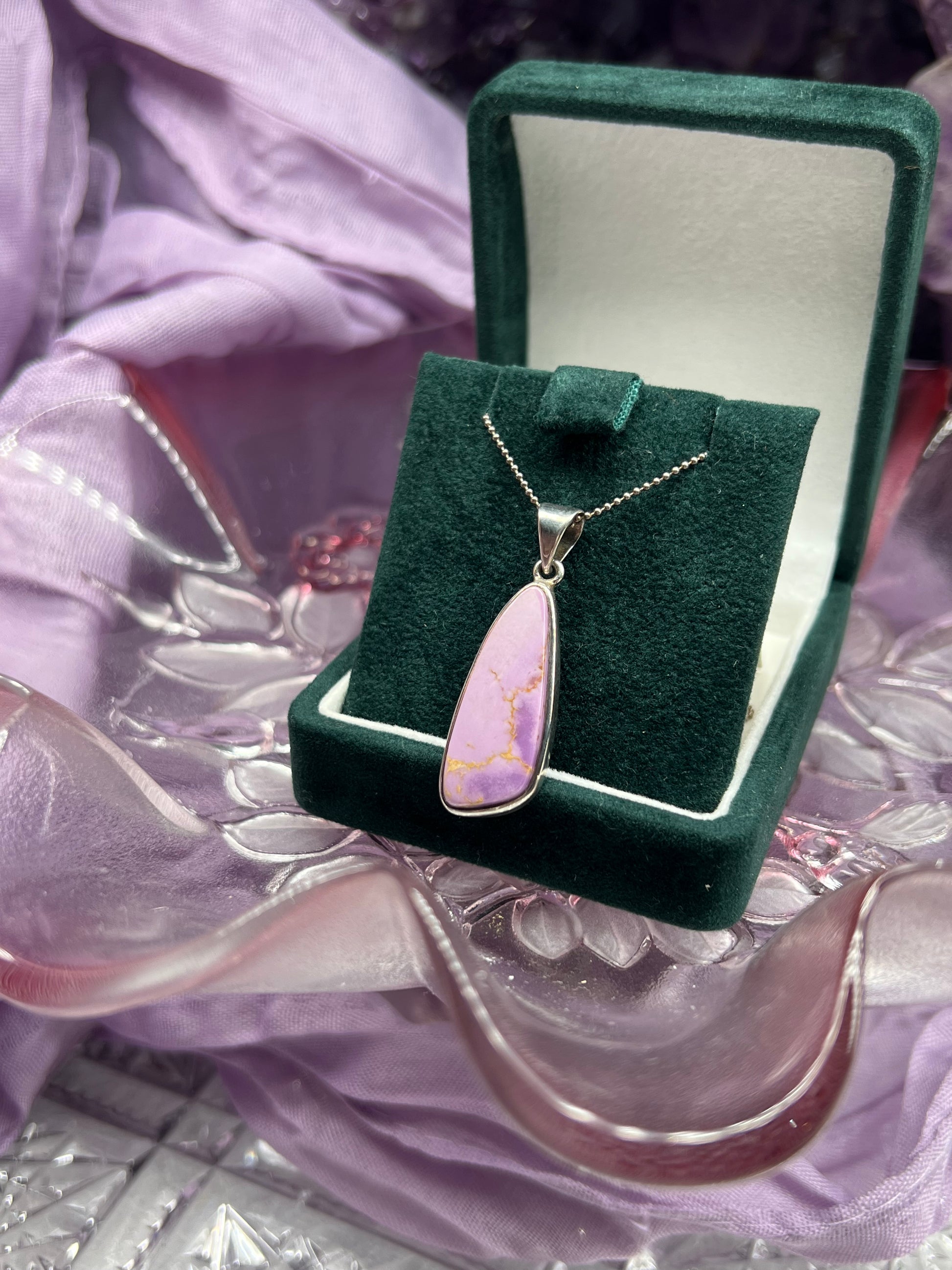 Bathed in lilac dreams and kissed with golden threads of light, this Phosphosiderite pendant holds an aura of serenity and higher connection. Handcrafted in 925 sterling silver, its soft pink and purple tones whisper of ancient lands and gentle healing energy.